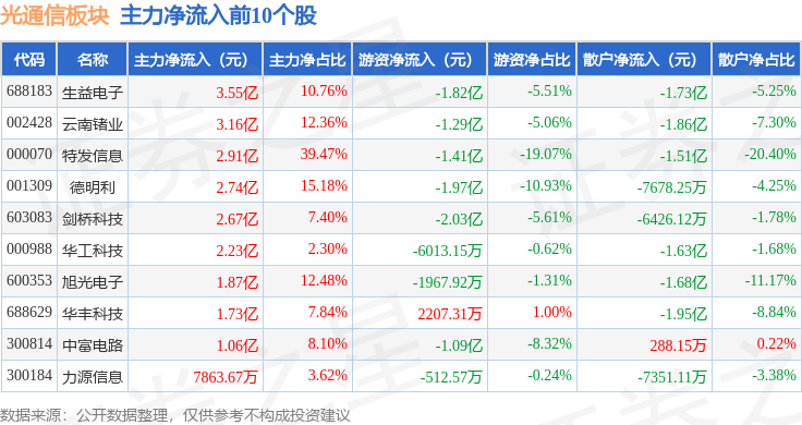 从资金流向上来看,当日光通信板块主力资金净流出71.11亿元,游资资金净流入21.12亿元,散户资金净流入49.99亿元。光通信板块个股资金流向见下表: