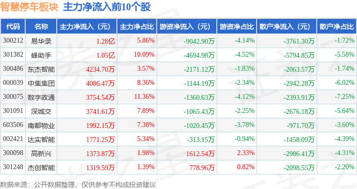 从资金流向上来看,当日智慧停车板块主力资金净流入211.99万元,游资资金净流出7329.31万元,散户资金净流入7117.32万元。智慧停车板块个股资金流向见下表: