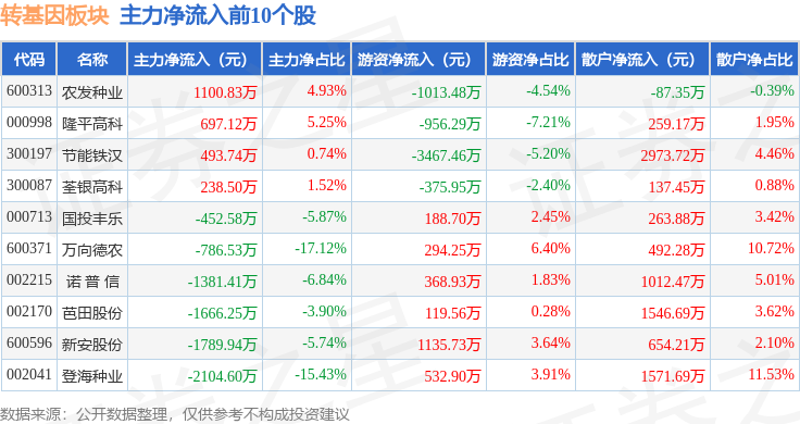 从资金流向上来看,当日转基因板块主力资金净流出1.02亿元,游资资金净流出4864.25万元,散户资金净流入1.51亿元。转基因板块个股资金流向见下表: