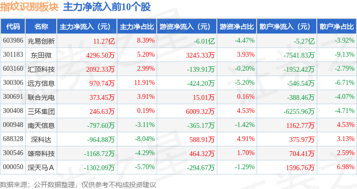 从资金流向上来看,当日指纹识别板块主力资金净流出5.14亿元,游资资金净流出2.7亿元,散户资金净流入7.84亿元。指纹识别板块个股资金流向见下表: