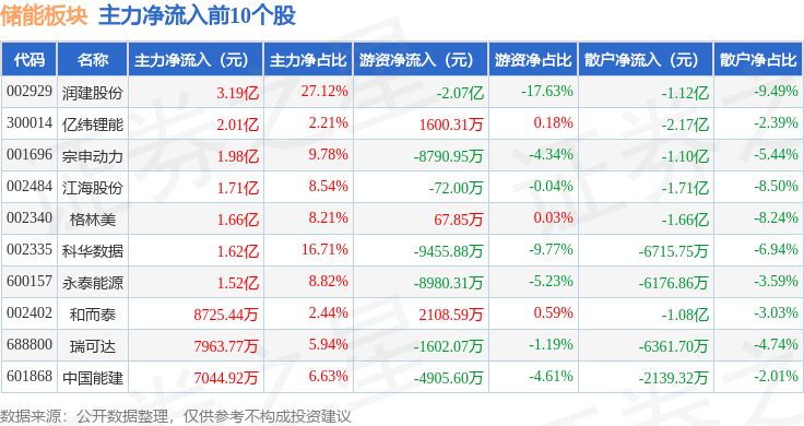 从资金流向上来看,当日储能板块主力资金净流出79.26亿元,游资资金净流入25.26亿元,散户资金净流入54.0亿元。储能板块个股资金流向见下表: