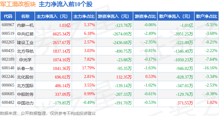 从资金流向上来看,当日军工混改板块主力资金净流出4.58亿元,游资资金净流入1.37亿元,散户资金净流入3.21亿元。军工混改板块个股资金流向见下表: