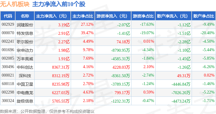 从资金流向上来看,当日无人机板块主力资金净流出13.03亿元,游资资金净流入1.14亿元,散户资金净流入11.89亿元。无人机板块个股资金流向见下表: