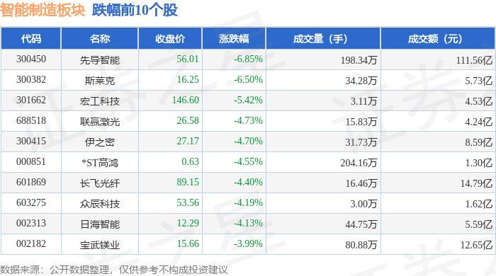 从资金流向上来看,当日智能制造板块主力资金净流出101.98亿元,游资资金净流入9.26亿元,散户资金净流入92.72亿元。智能制造板块个股资金流向见下表: