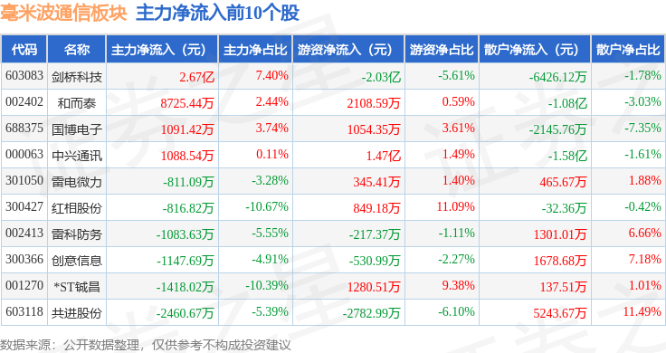 从资金流向上来看,当日毫米波通信板块主力资金净流出14.65亿元,游资资金净流入4.11亿元,散户资金净流入10.54亿元。毫米波通信板块个股资金流向见下表: