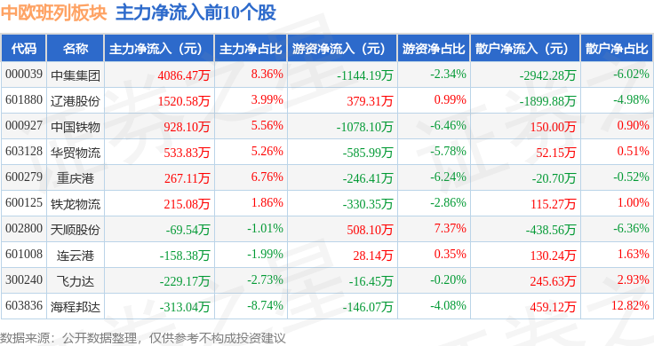 从资金流向上来看,当日中欧班列板块主力资金净流出3.19亿元,游资资金净流入1.68亿元,散户资金净流入1.51亿元。中欧班列板块个股资金流向见下表: