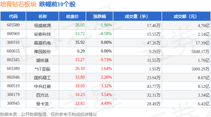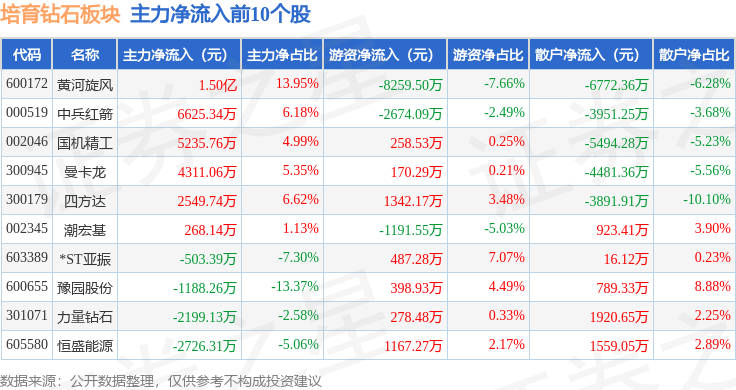 从资金流向上来看,当日培育钻石板块主力资金净流入1032.47万元,游资资金净流入1008.07万元,散户资金净流出2040.53万元。培育钻石板块个股资金流向见下表: