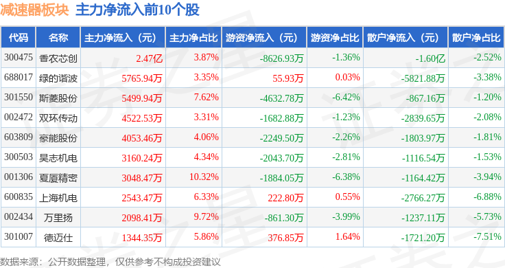 从资金流向上来看,当日减速器板块主力资金净流出7.21亿元,游资资金净流出1990.57万元,散户资金净流入7.41亿元。减速器板块个股资金流向见下表: