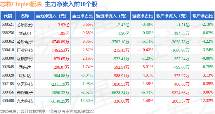 从资金流向上来看,当日芯粒Chiplet板块主力资金净流出3310.45万元,游资资金净流出4.62亿元,散户资金净流入4.96亿元。芯粒Chiplet板块个股资金流向见下表: