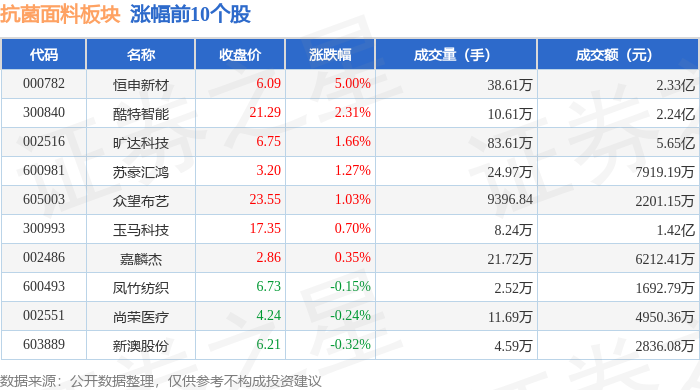 证券之星消息,9月12日抗菌面料板块较上一交易日下跌0.74%,南山智尚领跌。当日上证指数报收于3883.69,上涨0.22%。深证成指报收于12996.38,上涨0.13%。抗菌面料板块个股涨跌见下表: