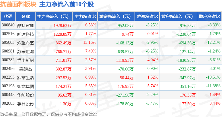 从资金流向上来看,当日抗菌面料板块主力资金净流出9847.68万元,游资资金净流入1283.06万元,散户资金净流入8564.61万元。抗菌面料板块个股资金流向见下表: