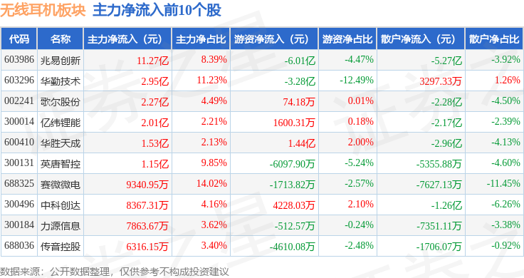 从资金流向上来看,当日无线耳机板块主力资金净流出26.72亿元,游资资金净流入4.44亿元,散户资金净流入22.29亿元。无线耳机板块个股资金流向见下表: