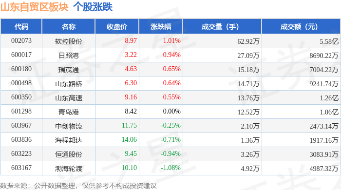 证券之星消息,9月12日山东自贸区板块较上一交易日上涨0.19%,软控股份领涨。当日上证指数报收于3883.69,上涨0.22%。深证成指报收于12996.38,上涨0.13%。山东自贸区板块个股涨跌见下表: