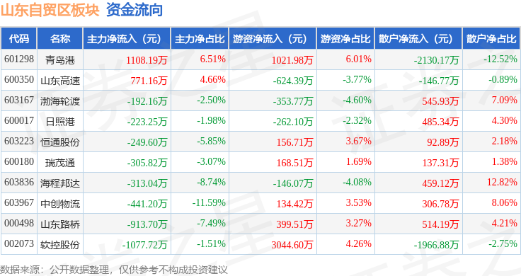 从资金流向上来看,当日山东自贸区板块主力资金净流出1837.14万元,游资资金净流入3539.41万元,散户资金净流出1702.27万元。山东自贸区板块个股资金流向见下表: