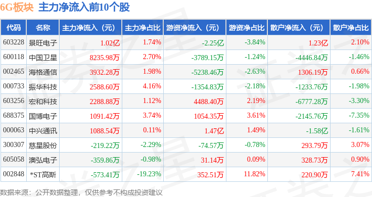 从资金流向上来看,当日6G板块主力资金净流出19.37亿元,游资资金净流入3.54亿元,散户资金净流入15.83亿元。6G板块个股资金流向见下表: