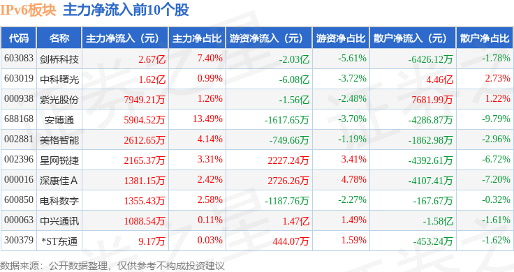 从资金流向上来看,当日IPv6板块主力资金净流出1.21亿元,游资资金净流出6.73亿元,散户资金净流入7.94亿元。IPv6板块个股资金流向见下表: