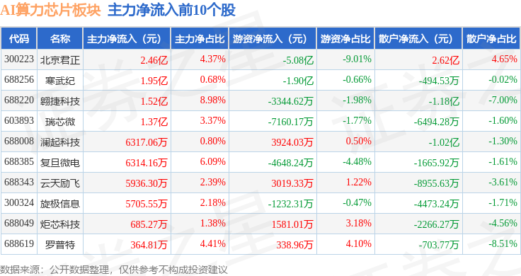 从资金流向上来看,当日AI算力芯片板块主力资金净流出4.84亿元,游资资金净流入3.05亿元,散户资金净流入1.78亿元。AI算力芯片板块个股资金流向见下表: