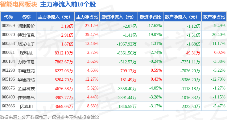 从资金流向上来看,当日智能电网板块主力资金净流出22.52亿元,游资资金净流入3.55亿元,散户资金净流入18.97亿元。智能电网板块个股资金流向见下表: