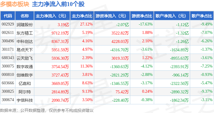 从资金流向上来看,当日多模态板块主力资金净流出20.88亿元,游资资金净流入4.21亿元,散户资金净流入16.67亿元。多模态板块个股资金流向见下表: