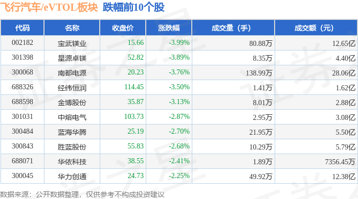 证券之星消息,9月12日飞行汽车/eVTOL板块较上一交易日下跌0.06%,宝武镁业领跌。当日上证指数报收于3883.69,上涨0.22%。深证成指报收于12996.38,上涨0.13%。飞行汽车/eVTOL板块个股涨跌见下表: