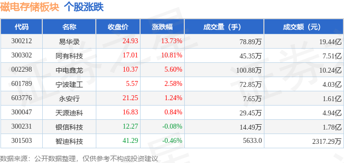 证券之星消息,9月12日磁电存储板块较上一交易日上涨4.74%,易华录领涨。当日上证指数报收于3883.69,上涨0.22%。深证成指报收于12996.38,上涨0.13%。磁电存储板块个股涨跌见下表: