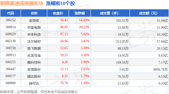 从资金流向上来看,当日铜缆高速连接器板块主力资金净流出42.22亿元,游资资金净流入12.35亿元,散户资金净流入29.87亿元。铜缆高速连接器板块个股资金流向见下表: