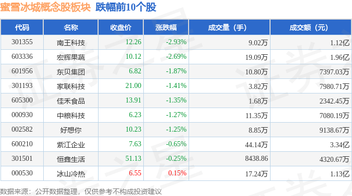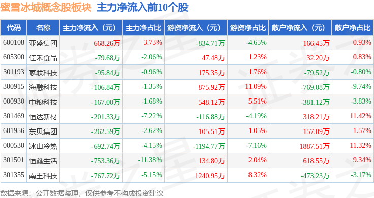 从资金流向上来看,当日蜜雪冰城概念股板块主力资金净流出1.22亿元,游资资金净流入4606.58万元,散户资金净流入7616.58万元。蜜雪冰城概念股板块个股资金流向见下表: