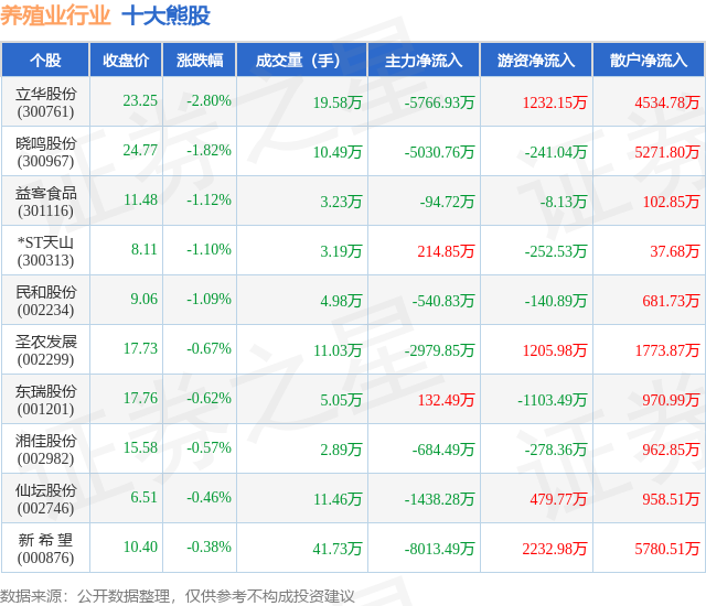 个股表现方面,养殖业行业当日领跌股为立华股份(300761),该股当日报收23.25,下跌2.8%,成交量19.58万,主力资金净流出5766.93万元。晓鸣股份(300967)以下跌1.82%紧随其后,该股当日成交量10.49万,主力资金净流出5030.76万元。除此之外,益客食品(301116)、*ST天山(300313)、民和股份(002234)均进入当日熊股之列。具体个股列表见下表: