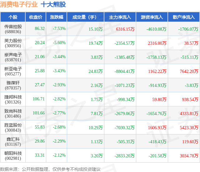 个股表现方面,消费电子行业当日领跌股为传音控股(688036),该股当日报收86.32,下跌7.53%,成交量15.1万,主力资金净流入6316.15万元。英力股份(300956)以下跌5.6%紧随其后,该股当日成交量19.74万,主力资金净流出2354.57万元。除此之外,豪声电子(838701)、新亚电子(605277)、雅葆轩(870357)均进入当日熊股之列。具体个股列表见下表: