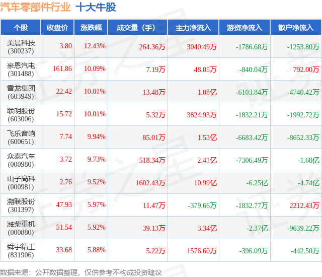 个股表现方面,汽车零部件行业当日领涨股为美晨科技(300237),该股当日报收3.8,上涨12.43%,成交量264.36万,主力资金净流入3040.49万元。豪恩汽电(301488)以上涨10.09%紧随其后,该股当日成交量7.19万,主力资金净流入48.05万元。除此之外,雪龙集团(603949)、联明股份(603006)、飞乐音响(600651)均进入当日牛股之列。具体个股列表见下表: