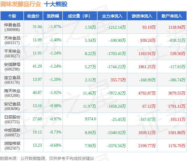 个股表现方面,调味发酵品行业当日领跌股为仲景食品(300908),该股当日报收31.94,下跌1.87%,成交量1.5万,主力资金净流出1212.14万元。天味食品(603317)以下跌1.4%紧随其后,该股当日成交量5.34万,主力资金净流出100.9万元。除此之外,千禾味业(603027)、安琪酵母(600298)、宝立食品(603170)均进入当日熊股之列。具体个股列表见下表: