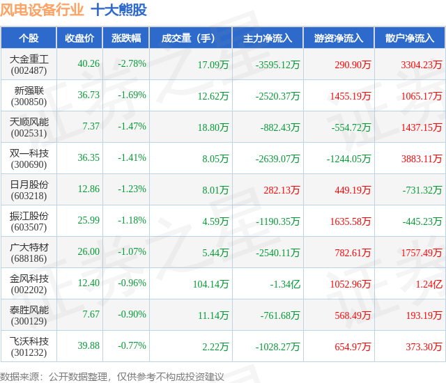 个股表现方面,风电设备行业当日领跌股为大金重工(002487),该股当日报收40.26,下跌2.78%,成交量17.09万,主力资金净流出3595.12万元。新强联(300850)以下跌1.69%紧随其后,该股当日成交量12.62万,主力资金净流出2520.37万元。除此之外,天顺风能(002531)、双一科技(300690)、日月股份(603218)均进入当日熊股之列。具体个股列表见下表: