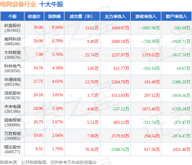 个股表现方面,电网设备行业当日领涨股为崧盛股份(301002),该股当日报收39.0,上涨8.94%,成交量11.61万,主力资金净流入1669.07万元。南网科技(688248)以上涨6.7%紧随其后,该股当日成交量9.49万,主力资金净流入2680.1万元。除此之外,大烨智能(300670)、科林电气(603050)、华通线缆(605196)均进入当日牛股之列。具体个股列表见下表: