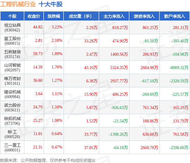 个股表现方面,工程机械行业当日领涨股为恒立钻具(836942),该股当日报收44.82,上涨3.22%,成交量2.29万,主力资金净流入818.27万元。厦工股份(600815)以上涨2.18%紧随其后,该股当日成交量33.28万,主力资金净流入474.9万元。除此之外,五新隧装(835174)、山河智能(002097)、唯万密封(301161)均进入当日牛股之列。具体个股列表见下表: