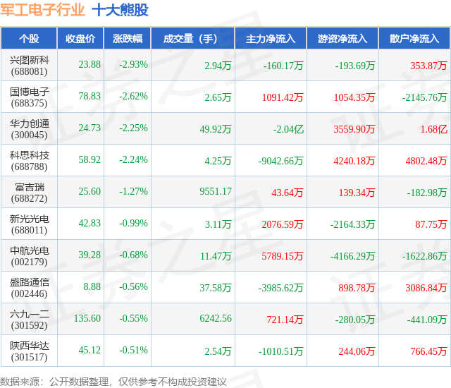 个股表现方面,军工电子行业当日领跌股为兴图新科(688081),该股当日报收23.88,下跌2.93%,成交量2.94万,主力资金净流出160.17万元。国博电子(688375)以下跌2.62%紧随其后,该股当日成交量2.65万,主力资金净流入1091.42万元。除此之外,华力创通(300045)、科思科技(688788)、富吉瑞(688272)均进入当日熊股之列。具体个股列表见下表: