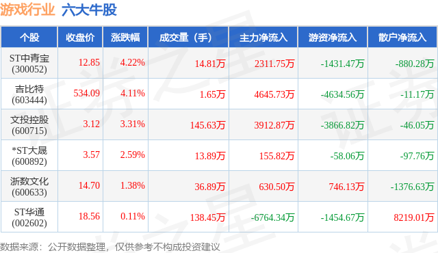 个股表现方面,游戏行业当日领涨股为ST中青宝(300052),该股当日报收12.85,上涨4.22%,成交量14.81万,主力资金净流入2311.75万元。吉比特(603444)以上涨4.11%紧随其后,该股当日成交量1.65万,主力资金净流入4645.73万元。除此之外,文投控股(600715)、*ST大晟(600892)、浙数文化(600633)均进入当日牛股之列。具体个股列表见下表: