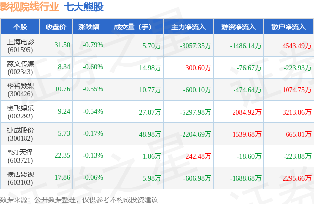 个股表现方面,影视院线行业当日领跌股为上海电影(601595),该股当日报收31.5,下跌0.79%,成交量5.7万,主力资金净流出3057.35万元。慈文传媒(002343)以下跌0.6%紧随其后,该股当日成交量14.98万,主力资金净流入300.6万元。除此之外,华智数媒(300426)、奥飞娱乐(002292)、捷成股份(300182)均进入当日熊股之列。具体个股列表见下表: