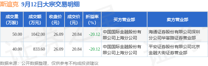 证券之星消息,9月12日斯迪克发生大宗交易,交易数据如下: