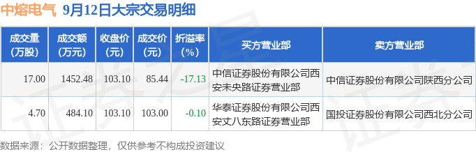 证券之星消息,9月12日中熔电气发生大宗交易,交易数据如下: