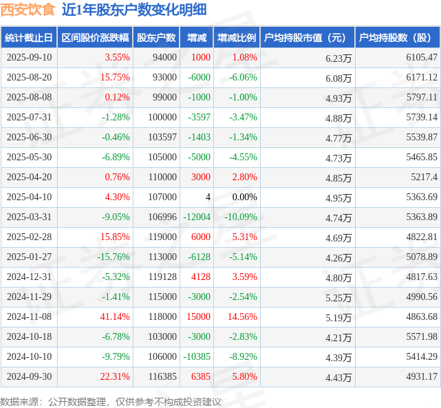从股价来看,2025年8月20日至2025年9月10日,西安饮食区间涨幅为3.55%,在此期间股东户数增加1000.0户,增幅为1.08%。