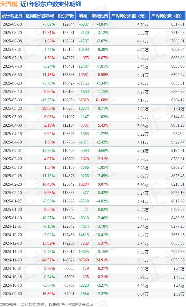 从股价来看,2025年8月20日至2025年9月10日,天汽模区间跌幅为5.82%,在此期间股东户数减少6207.0户,减幅为4.84%。