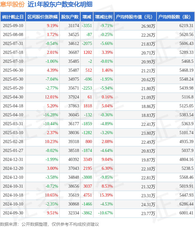 从股价来看,2025年8月8日至2025年9月10日,意华股份区间涨幅为9.19%,在此期间股东户数减少3351.0户,减幅为9.71%。
