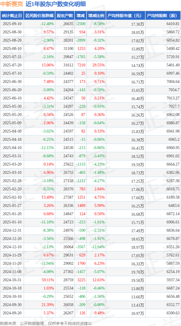 从股价来看,2025年8月30日至2025年9月10日,中新赛克区间跌幅为12.4%,在此期间股东户数减少2500.0户,减幅为8.58%。