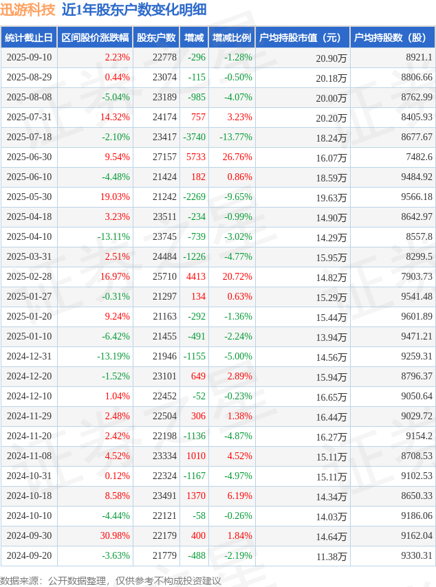 从股价来看,2025年8月29日至2025年9月10日,迅游科技区间涨幅为2.23%,在此期间股东户数减少296.0户,减幅为1.28%。