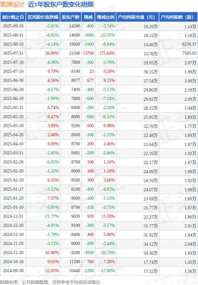 从股价来看,2025年8月31日至2025年9月10日,筑博设计区间跌幅为2.01%,在此期间股东户数减少400.0户,减幅为2.74%。