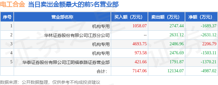 证券之星消息,沪深交易所2025年9月12日公布的交易公开信息显示,电工合金(300697)因日涨幅达到15%的前5只证券登上龙虎榜。此次是近5个交易日内第1次上榜。