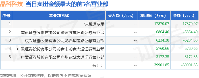 证券之星消息,沪深交易所2025年9月12日公布的交易公开信息显示,晶科科技(601778)因有价格涨跌幅限制的日收盘价格跌幅偏离值达到7%的前五只证券登上龙虎榜。此次是近5个交易日内第2次上榜。