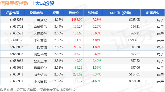 证券之星消息,9月12日,信息等权(000077)指数报收于5751.42点,涨1.9%,成交1934.44亿元,换手率2.69%。当日该指数成份股中,上涨的有24家,芯原股份以20.0%的涨幅领涨,下跌的有26家,传音控股以7.49%的跌幅领跌。