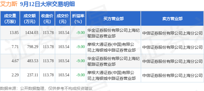证券之星消息,9月12日艾力斯发生大宗交易,交易数据如下: