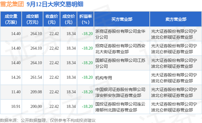证券之星消息,9月12日雪龙集团发生大宗交易,交易数据如下: